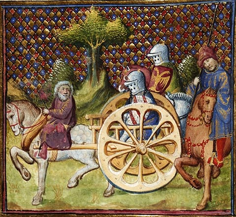 Gauvain se lance à leur poursuite, bientôt rejoint par un chevalier inconnu qui, en échange de nouvelles de la reine, accepte de monter dans une charrette, marque d’infamie et de déshonneur. (Ce chevalier n’est autre que Lancelot, mais à ce stade du récit, son identité est tenue secrète.)